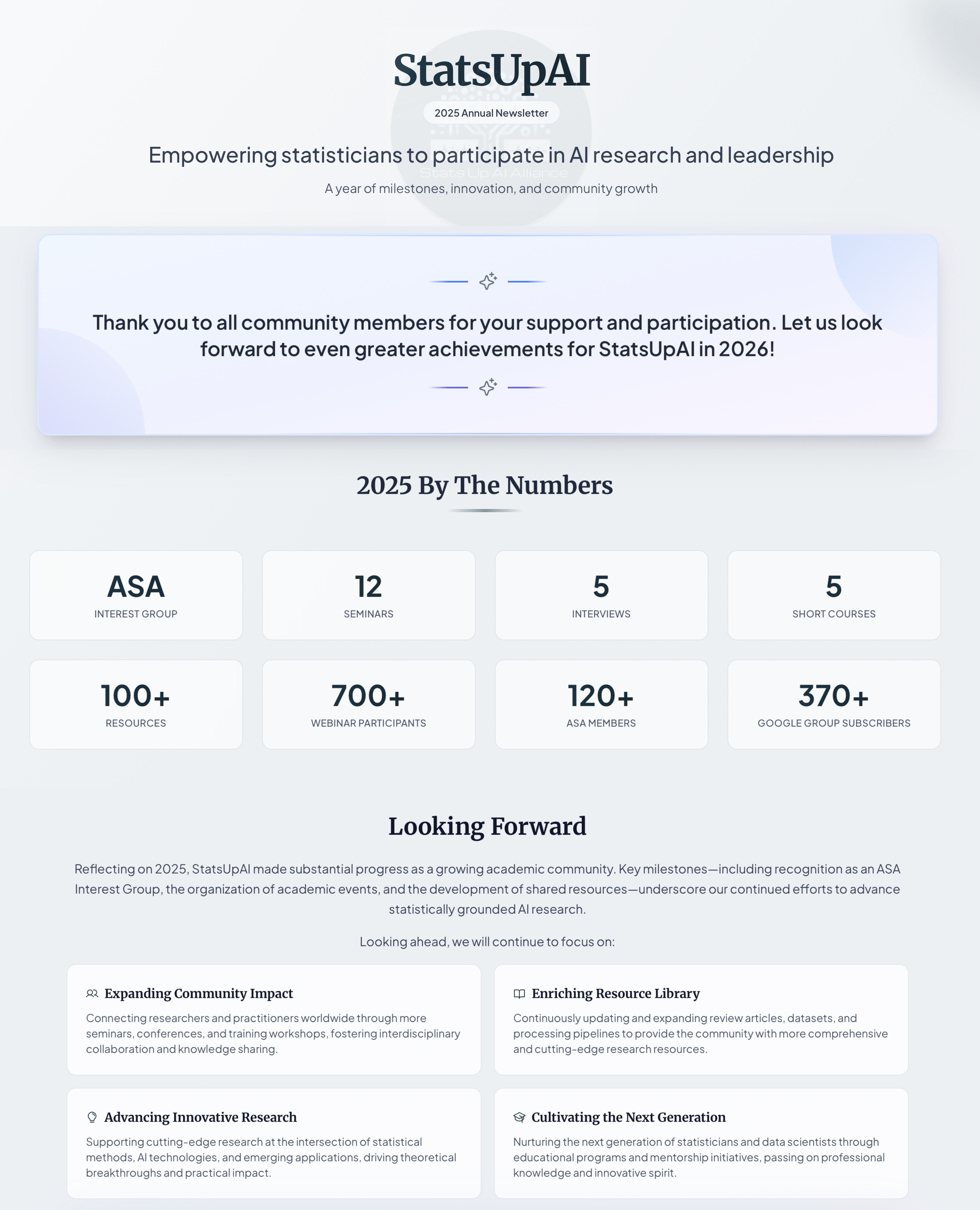2025 has been a year filled with milestones, innovation, and community growth for StatsUpAI, as you will learn from reading this newsletter. Each of our accomplishments reflects not just what we’ve built, but people who have built it — a dedicated, generous, and vibrant network of researchers, students, educators, and practitioners.